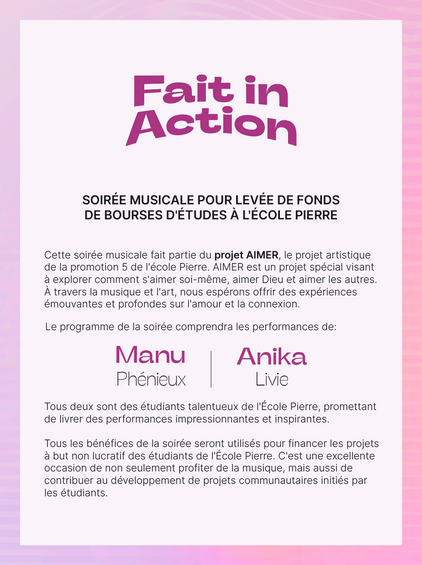 Cette soirée musicale fait partie du projet AIMER, le projet artistique de la promotion 5 de l'école Pierre. AIMER est un projet spécial visant à explorer comment s'aimer soi-même, aimer Dieu et aimer les autres. À travers la musique et l'art, nous espérons offrir des expériences émouvantes et profondes sur l'amour et la connexion.
